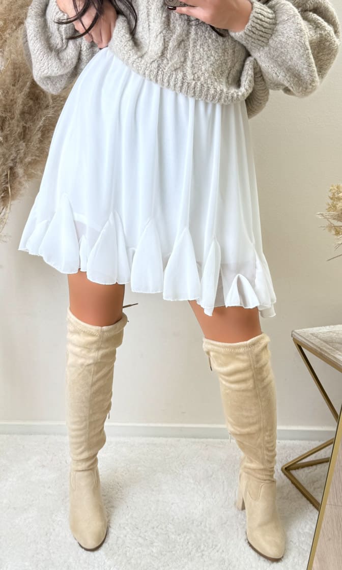 Nutze den Rüschenrock als zentrales Element eines Layering-Outfits – kombiniere ihn mit einem leichten Cardigan oder einer schicken Strickjacke. -