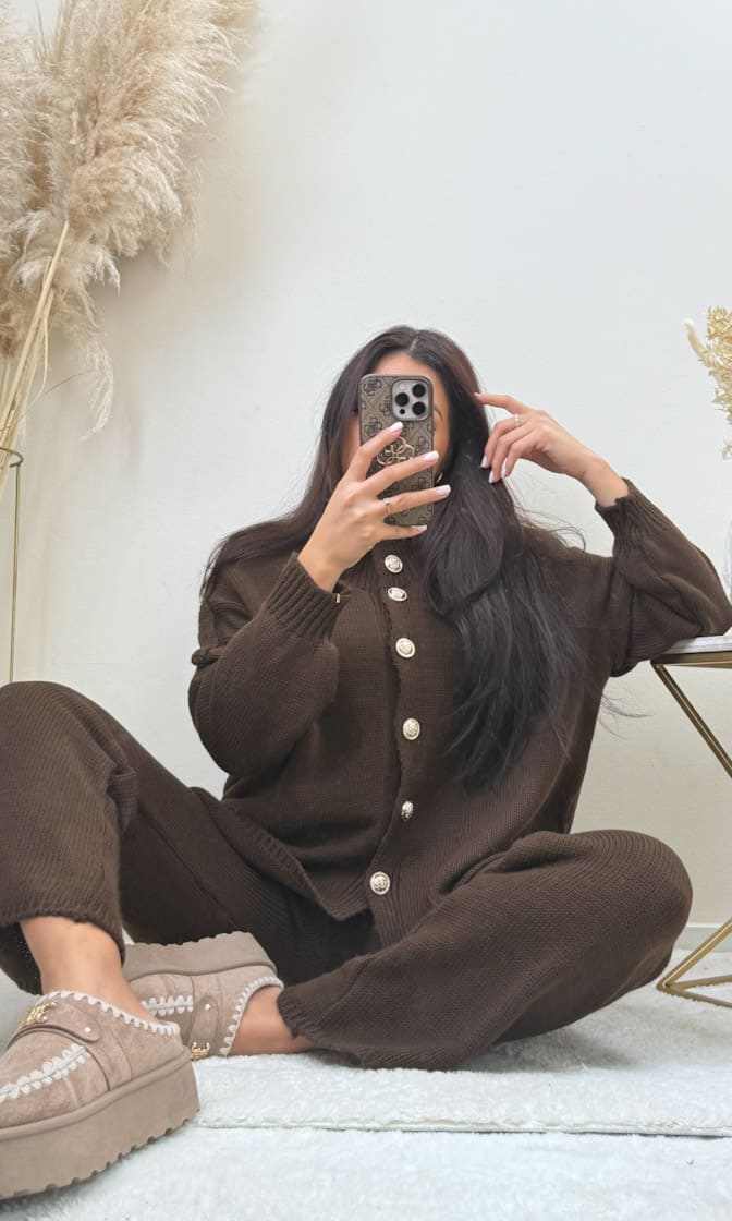 Ein kuschelweiches, leicht oversize geschnittenes Set mit eleganten Goldknöpfen – perfekt für den Winter und ideal für gemütliche Alltagslooks.
