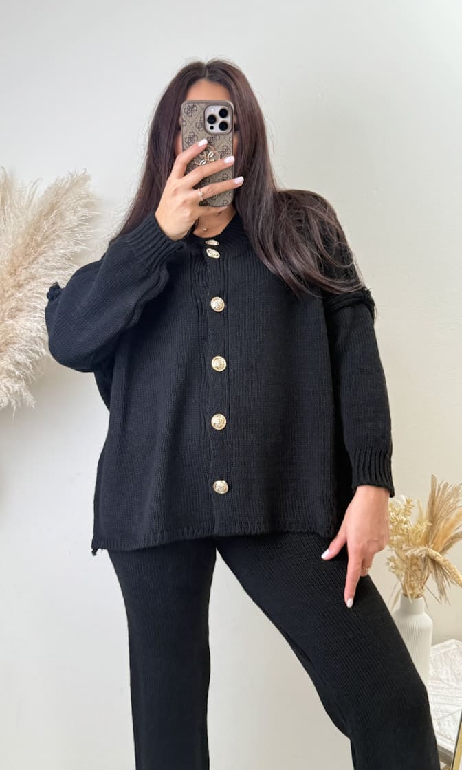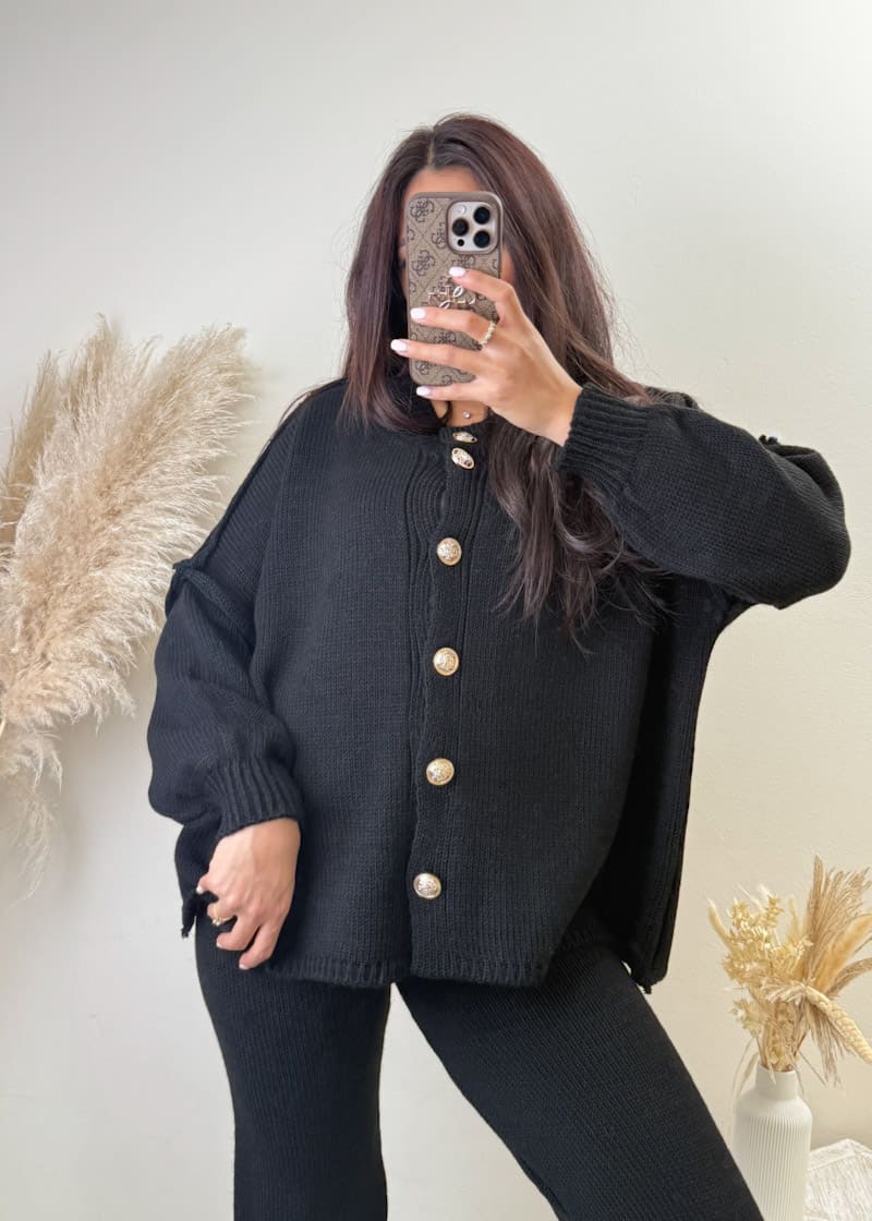 goldknopf cardigan damen, set mit goldknöpfen, cozy set damen winter, oversize cardigan goldknöpfe, femzo cardigan set, winter set damen