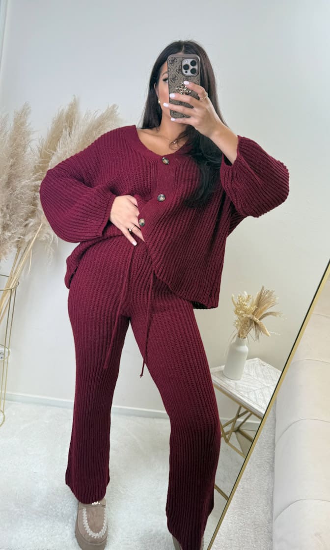 - Outfit-Idee: Trage das Strick-Set als komplettes Ensemble – der weiche Cardigan und die bequeme Hose bilden zusammen einen harmonischen Look. Kombiniere es mit Sneakers oder flachen Loafers, um einen urbanen Casual-Look zu kreieren.