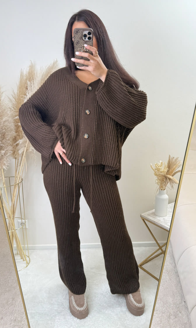 Unser Strick-Set ist mehr als nur ein Outfit – es ist ein Ausdruck deiner Persönlichkeit, deines Stils und deines Bedürfnisses nach Komfort. Das Set besteht aus einem weichen, lässigen Cardigan und einer bequemen Hose, die zusammen ein harmonisches, modernes Ensemble bilden.